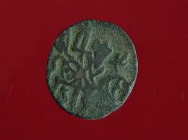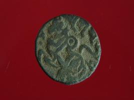 | Description / विवरण | This is a copper coin with coating of silver on it. The depression on obverse side depicts a deity sitting on a horse and holding a spear in his right hand. On reverse side a bull in a sitting position and some inscriptions are written above. Shape is almost circular. Surface is smooth. Appearance is metallic bronze. |