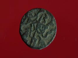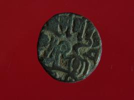 | Description / विवरण | This is a copper coin with coating of silver on it. The depression on obverse side depicts a deity sitting on a horse and holding a spear in his right hand. On reverse side a bull in a sitting position and some inscriptions are written above. Shape is almost circular. Surface is smooth. Appearance is metallic bronze. |
