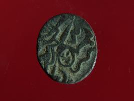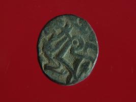 | Description / विवरण | This is a copper coin with coating of silver on it. The depression on obverse side depicts a deity sitting on a horse and holding a spear in his right hand. On reverse side a bull in a sitting position and some inscriptions are written above. Shape is almost circular. Surface is smooth. Appearance is metallic bronze. |