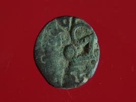 | Description / विवरण | This is a copper coin with coating of silver on it. The depression on obverse side depicts a deity sitting on a horse and holding a spear in his right hand. On reverse side a bull in a sitting position and some inscriptions are written above. Shape is almost circular. Surface is smooth. Appearance is metallic bronze. |