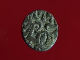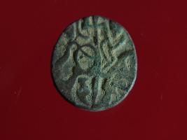 | Description / विवरण | This is a copper coin with coating of silver on it. The depression on obverse side depicts a deity sitting on a horse and holding a spear in his right hand. On reverse side a bull in a sitting position and some inscriptions are written above. Shape is almost circular. Surface is smooth. Appearance is metallic bronze. |