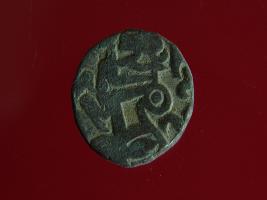 | Description / विवरण | This is a copper coin with coating of silver on it. The depression on obverse side depicts deity sitting on a horse and holding a spear in his right hand. On reverse side image cannot be identified. Shape is almost circular. Surface is smooth. Appearance is metallic bronze. |