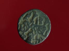 | Description / विवरण | This is a copper coin with coating of silver on it. The depression on obverse side depicts a deity sitting on a horse and holding a spear in his right hand. On reverse side a bull in a sitting position and some inscriptions are written above. Shape is almost circular. Surface is smooth. Appearance is metallic bronze. |