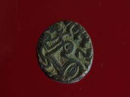 | Description / विवरण | This is a copper coin. It is a silver coating coin. The depression on obverse side depicts a deity sitting on a horse and holding a spear in his right hand. On reverse side a bull in a sitting position. Shape is almost circular. Surface is smooth. Appearance is metallic bronze. |