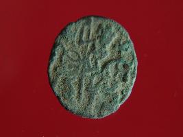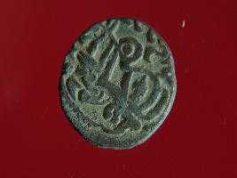 | Description / विवरण | This is a copper coin. Shape is almost circular. Surface is smooth. The depression on obverse side depicts deity sitting on a horse and holding a trident in his right hand. On reverse side a bull in a standing position. Appearance is metallic bronze. Hard patina deposited on it. |
