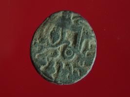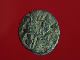 | Description / विवरण | This is a copper coin with coating of silver on it. The depression on obverse side depicts a deity sitting on a horse and holding a spear in his right hand. On reverse side a bull in a standing position. Shape is almost circular. Surface is smooth. Appearance is metallic bronze. |