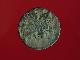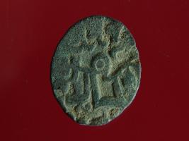 | Description / विवरण | This is a copper coin with silver coating on it. The depression on obverse side depicts a deity sitting on a horse and holding a spear in his right hand. On reverse side a bull in a standing position. Shape is almost circular. Surface is smooth. Appearance is metallic bronze. |