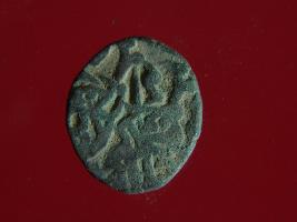 | Description / विवरण | This is a copper coin with coating of silver on it. The depression on obverse side depicts a deity sitting on a horse and holding a trident in his right hand. On reverse side a bull in a sitting position. Shape is almost circular. Surface is smooth. Appearance is metallic bronze. |