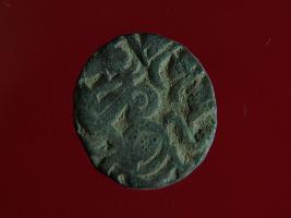 | Description / विवरण | This is a copper coin with coating of silver on it. . The depression on obverse side depicts deity sitting on a horse and holding a spear in his right hand. On reverse side image cannot be identified. Shape is almost circular. Surface is smooth. Appearance is metallic bronze. Hard patina deposited on it. |