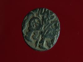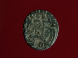 | Description / विवरण | This is a copper coin with coating of silver on it. The depression on obverse side depicts a deity sitting on a horse and holding a spear in his right hand. On reverse side a bull in a sitting position. Shape is almost circular. Surface is smooth. Appearance is metallic bronze. |