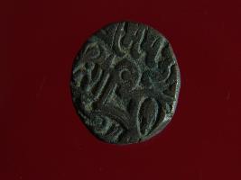 | Description / विवरण | This is a copper coin with coating of silver on it. The depression on obverse side depicts deity sitting on a horse and holding a spear in his right hand. On reverse side a bull in a sitting position. Shape is almost circular. Surface is smooth. Appearance is metallic bronze. |