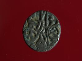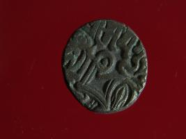 | Description / विवरण | This is a copper coin with coating of silver on it. The depression on obverse side depicts deity sitting on a horse and holding a spear in his right hand. On reverse side a bull in a sitting position. Shape is almost circular. Surface is smooth. Appearance is metallic bronze. |