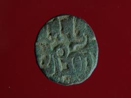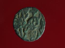 | Description / विवरण | This is a copper coin with silver coating. The depression on obverse side depicts deity sitting on a horse and holding a spear in his right hand. On reverse side a bull in a sitting position. Shape is almost circular. Surface is smooth. Appearance is metallic bronze. |