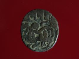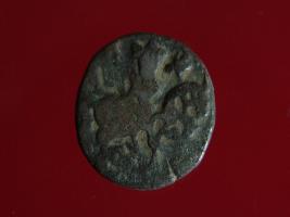 | Description / विवरण | This is a copper coin with silver coating. The depression on obverse side depicts deity sitting on a horse and holding a spear in his right hand. On reverse side a bull in a sitting position. Shape is almost circular. Surface is smooth. Appearance is metallic bronze. |