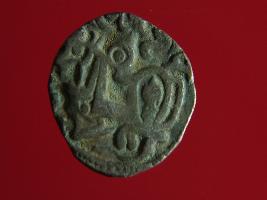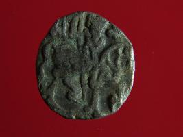 | Description / विवरण | This is a copper coin with silver coating. The depression on obverse side depicts deity sitting on a horse and holding a spear in his right hand. On reverse side a bull in a sitting position. Shape is almost circular. Surface is smooth. Appearance is metallic bronze. |