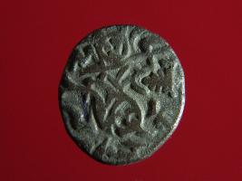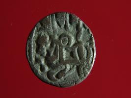 | Description / विवरण | This is a copper coin with silver coating. The depression on obverse side depicts deity sitting on a horse and holding a spear in his right hand. On reverse side a bull in a sitting position. Shape is almost circular. Surface is smooth. Appearance is metallic bronze. |