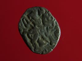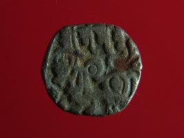 | Description / विवरण | This is a copper coin with silver coating. The depression on obverse side depicts deity sitting on a horse and holding a spear in his right hand. On reverse side a bull in a sitting position. Shape is almost circular. Surface is smooth. Appearance is metallic bronze. |