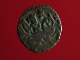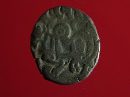 | Description / विवरण | This is a copper coin with silver coating. The depression on obverse side depicts deity sitting on a horse and holding a spear in his right hand. On reverse side a bull in a sitting position. Shape is almost circular. Surface is smooth. Appearance is metallic bronze. |