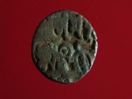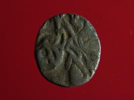 | Description / विवरण | This is a copper coin with silver coating. The depression on obverse side depicts deity sitting on a horse and holding a spear in his right hand. On reverse side a bull in a sitting position. Shape is almost circular. Surface is smooth. Appearance is metallic bronze. |