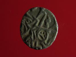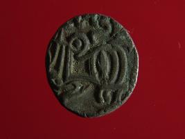 | Description / विवरण | This is a copper coin with silver coating. The depression on obverse side depicts deity sitting on a horse and holding a spear in his right hand. On reverse side a bull in a sitting position. Shape is almost circular. Surface is smooth. Appearance is metallic bronze. |