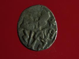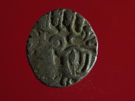 | Description / विवरण | This is a copper coin with silver coating. The depression on obverse side depicts deity sitting on a horse and holding a spear in his right hand. On reverse side a bull in a sitting position. Shape is almost circular. Surface is smooth. Appearance is metallic bronze. |
