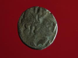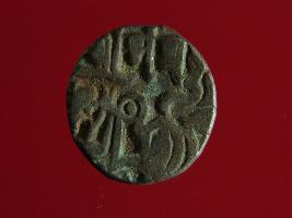 | Description / विवरण | This is a copper coin with silver coating. The depression on obverse side depicts deity sitting on a horse and holding a spear in his right hand. On reverse side a bull in a sitting position. Shape is almost circular. Surface is smooth. Appearance is metallic bronze. |