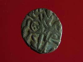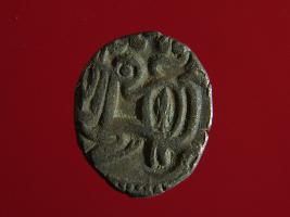| Description / विवरण | This is a copper coin with silver coating. The depression on obverse side depicts deity sitting on a horse and holding a spear in his right hand. On reverse side a bull in a sitting position. Shape is almost circular. Surface is smooth. Appearance is metallic bronze. |