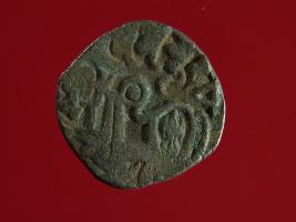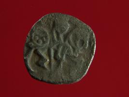 | Description / विवरण | This is a copper coin with silver coating. The depression on obverse side depicts deity sitting on a horse and holding a spear in his right hand. On reverse side a bull in a sitting position. Shape is almost circular. Surface is smooth. Appearance is metallic bronze. |
