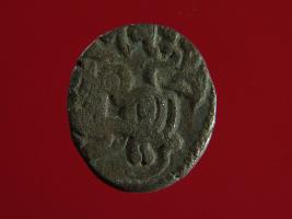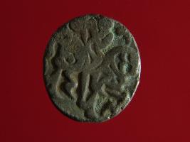 | Description / विवरण | This is a copper coin with silver coating. The depression on obverse side depicts deity sitting on a horse and holding a trident in his right hand. On reverse side a bull in a standing position. Shape is almost circular. Surface is smooth. Appearance is metallic bronze. |