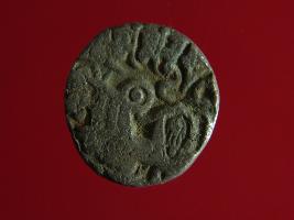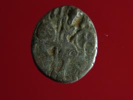 | Description / विवरण | This is a copper coin with silver coating. The depression on obverse side depicts deity sitting on a horse and holding a trident in his right hand. On reverse side a bull in a standing position. Shape is almost circular. Surface is smooth. Appearance is metallic bronze. |