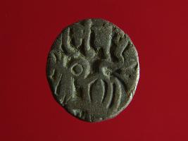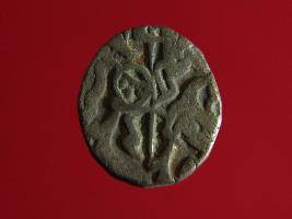 | Description / विवरण | This is a copper coin with silver coating. The depression on obverse side depicts deity sitting on a horse and holding a trident in his right hand. On reverse side a bull in a standing position. Shape is almost circular. Surface is smooth. Appearance is metallic bronze. |