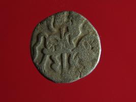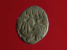 | Description / विवरण | This is a copper coin with silver coating. The depression on obverse side depicts deity sitting on a horse and holding a spear in his right hand. On reverse side a bull in a sitting position. Shape is almost circular. Surface is smooth. Appearance is metallic bronze. |