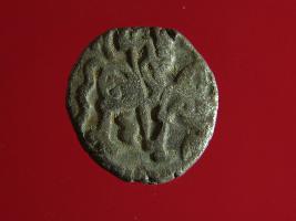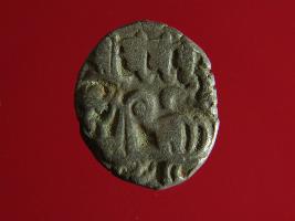 | Description / विवरण | This is a copper coin with silver coating. The depression on obverse side depicts deity sitting on a horse and holding a trident in his right hand. On reverse side a bull in a standing position. Shape is almost circular. Surface is smooth. Appearance is metallic bronze. |