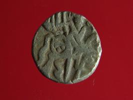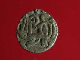 | Description / विवरण | This is a copper coin with silver coating. The depression on obverse side depicts deity sitting on a horse and holding a trident in his right hand. On reverse side a bull in a standing position. Shape is almost circular. Surface is smooth. Appearance is metallic bronze. |
