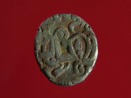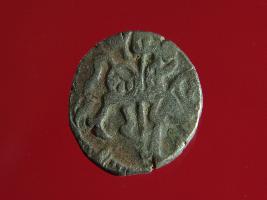 | Description / विवरण | This is a copper coin with silver coating. The depression on obverse side depicts deity sitting on a horse and holding a trident in his right hand. On reverse side a bull in a standing position. Shape is almost circular. Surface is smooth. Appearance is metallic bronze. |