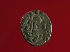 | Description / विवरण | This is a copper coin with silver coating. The depression on obverse side depicts deity sitting on a horse and holding a spear in his right hand. On reverse side a bull in a sitting position. Shape is almost circular. Surface is smooth. Appearance is metallic bronze. |