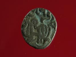 | Description / विवरण | This is a copper coin with silver coating. The depression on obverse side depicts deity sitting on a horse and holding a spear in his right hand. On reverse side a bull in a sitting position. Shape is almost circular. Surface is smooth. Appearance is metallic bronze. |