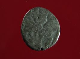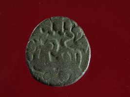 | Description / विवरण | This is a copper coin with silver coating. The depression on obverse side depicts deity sitting on a horse and holding a trident in his right hand. On reverse side a bull in a standing position. Shape is almost circular. Surface is smooth. Appearance is metallic bronze. |