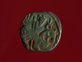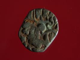 | Description / विवरण | This is a copper coin with silver coating. The depression on obverse side depicts deity sitting on a horse and holding a spear in his right hand. On reverse side a bull in a sitting position. Shape is almost circular. Surface is smooth. Appearance is metallic bronze. |