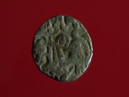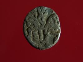 | Description / विवरण | This is a copper coin with silver coating. The depression on obverse side depicts deity sitting on a horse and holding a spear in his right hand. On reverse side a bull in a sitting position. Shape is almost circular. Surface is smooth. Appearance is metallic bronze. |