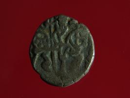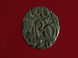 | Description / विवरण | This is a copper coin with silver coating. The depression on obverse side depicts deity sitting on a horse and holding a spear in his right hand. On reverse side a bull in a sitting position. Shape is almost circular. Surface is smooth. Appearance is metallic bronze. |