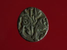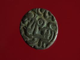 | Description / विवरण | This is a copper coin with silver coating. The depression on obverse side depicts deity sitting on a horse and holding a spear in his right hand. On reverse side a bull in a sitting position. Shape is almost circular. Surface is smooth. Appearance is metallic bronze. |