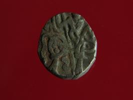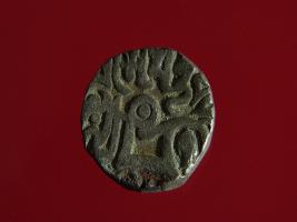 | Description / विवरण | This is a copper coin with silver coating. The depression on obverse side depicts deity sitting on a horse and holding a spear in his right hand. On reverse side a bull in a sitting position. Shape is almost circular. Surface is smooth. Appearance is metallic bronze. |