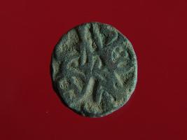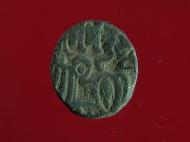 | Description / विवरण | This is a copper coin. The depression on obverse side depicts deity sitting on a horse and holding a spear in his right hand. On reverse side a bull in a sitting position. Shape is almost circular. Surface is smooth. Appearance is metallic bronze. |