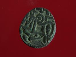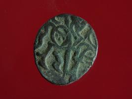 | Description / विवरण | This is a copper coin. The depression on obverse side depicts deity sitting on a horse and holding a spear in his right hand. On reverse side a bull in a sitting position. Shape is almost circular. Surface is smooth. Appearance is metallic bronze. |