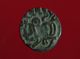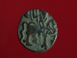 | Description / विवरण | This is a copper coin.The depression on obverse side depicts a deity sittting on a horse and holding a spear in his right hand and on reverse side a bull in a sitting position. Shape is circular. Surface is smooth. Appearance is metalic bronze. Hard patina deposited on it. |