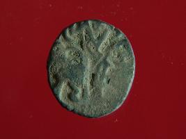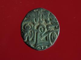 | Description / विवरण | This is a copper coin. The depression on obverse side depicts deity sitting on a horse and holding a spear in his right hand. On reverse side a bull in a sitting position. Shape is almost circular. Surface is smooth. Appearance is metallic bronze. |