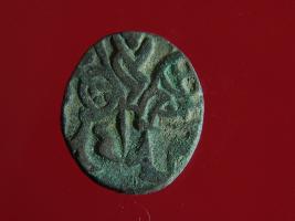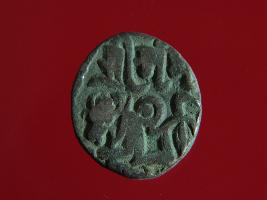 | Description / विवरण | This is a copper coin with silver coating. The depression on obverse side depicts deity sitting on a horse and holding a spear in his right hand. On reverse side a bull in a sitting position. Shape is almost circular. Surface is smooth. Appearance is metallic bronze. |