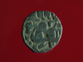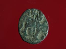 | Description / विवरण | This is a copper coin. The depression on obverse side depicts deity sitting on a horse and holding a spear in his right hand. On reverse side a bull in a sitting position. Shape is almost circular. Surface is smooth. Appearance is metallic bronze. |