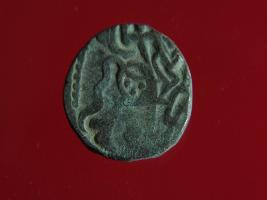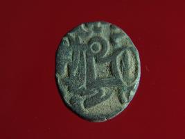 | Description / विवरण | This is a copper coin with silver coating. The depression on obverse side depicts deity sitting on a horse and holding a trident in his right hand. On reverse side a bull in a standing position. Shape is almost circular. Surface is smooth. Appearance is metallic bronze. |
